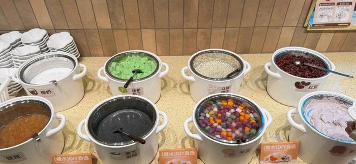 之后是类似优优烤板栗、高山烤蜜薯、潮汕甜汤、半熟芝士等流行甜点和小吃的设置,也能增加产品的丰富度。以潮汕甜汤为例,总共有椰奶、抹茶布丁、芋泥8个品种,顾客可自行DIY。