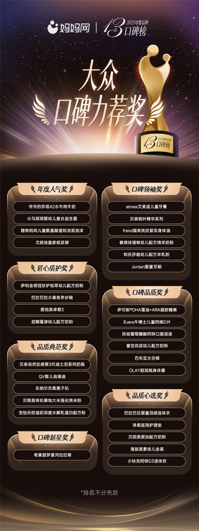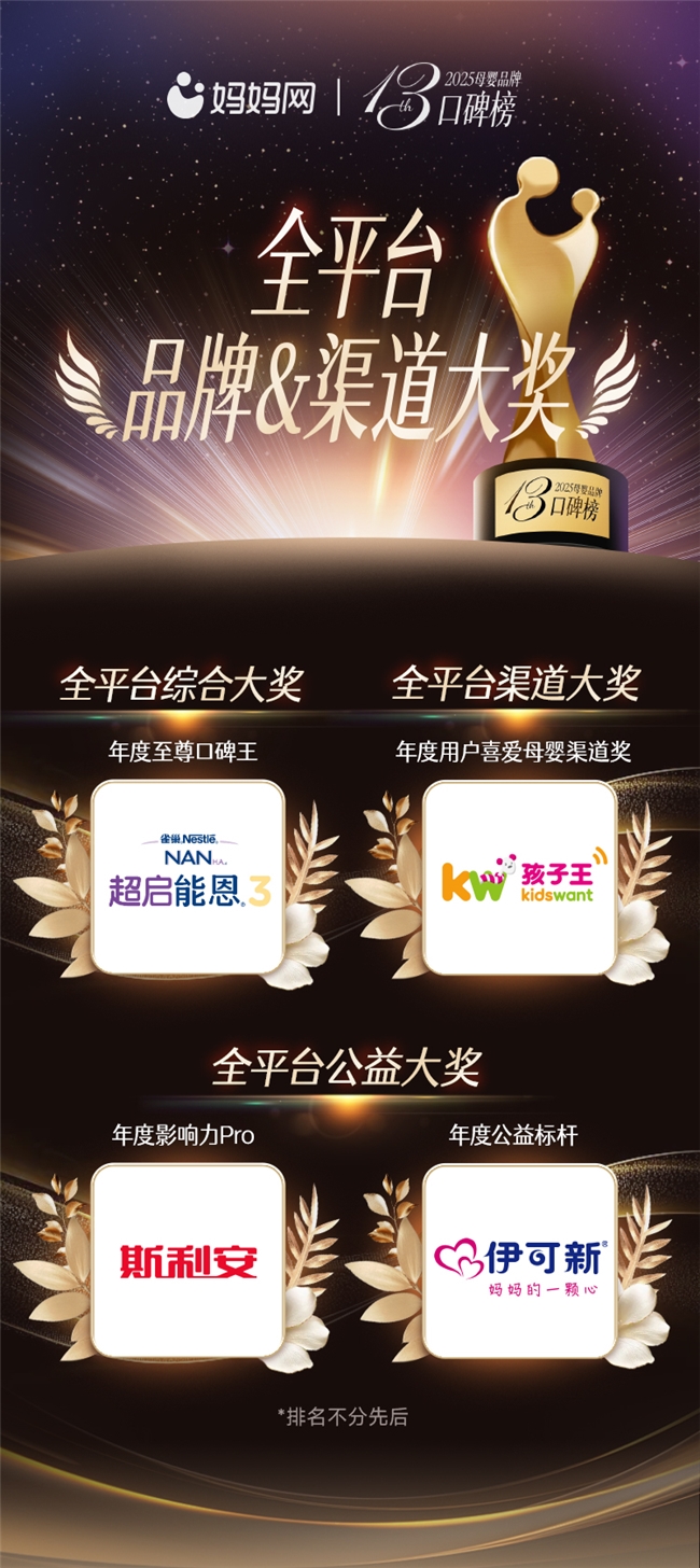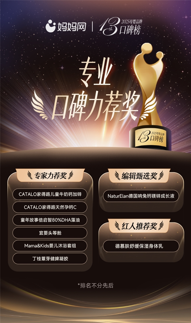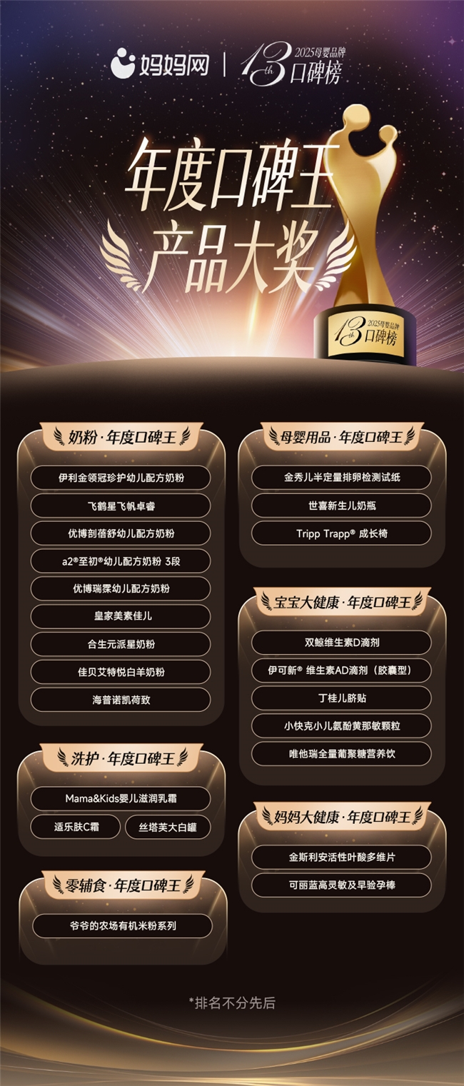 2025年12月19日,第十三届妈妈网母婴品牌口碑榜正式揭晓。本届榜单以“智慧羽翼,金榜引航”为主题,依托妈妈网在母婴行业二十余年的专业积淀与口碑榜十三年的持续深耕,为万千中国家庭权威呈上一份涵盖全周期的母婴消费指南,致力于为中国家庭提供从备孕到学龄前各阶段的权威产品参考与选购支持。